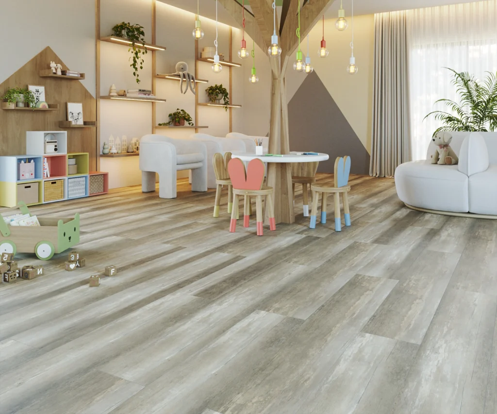 Piso com nuances brancas e delicados veios de madeira. Ideal para iluminar os ambientes e criar uma sensação de amplitude, tornando-os visualmente mais espaçosos.